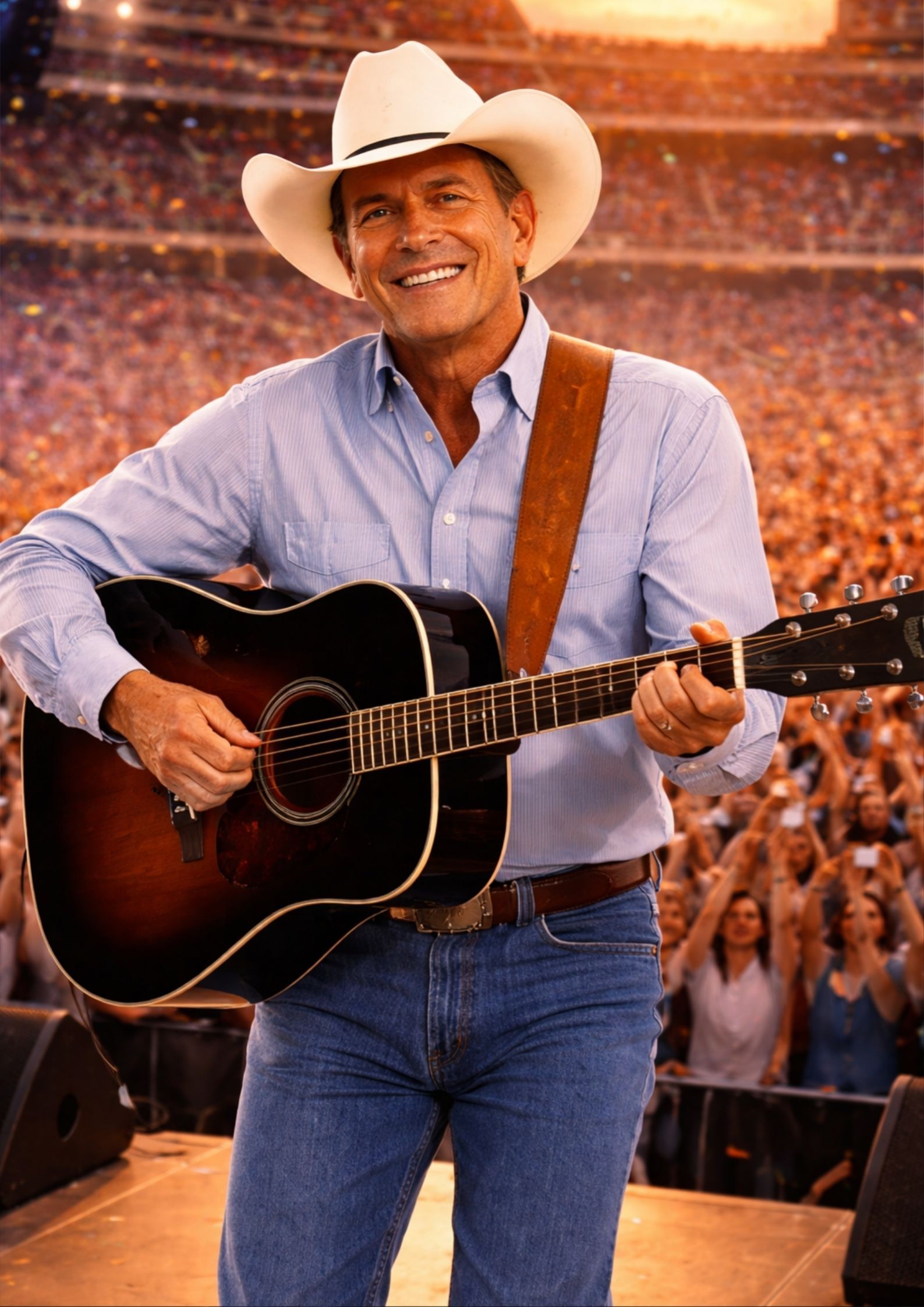 The night had begun like countless others on Strait’s long, storied road. The crowd was electric. Cowboy hats swayed beneath the lights. Phones glowed like distant stars as the “King of Country” delivered hit after hit with the calm confidence that has defined him for decades. His baritone voice rolled across the stadium, steady and unshaken, as fans sang along to songs that had carried them through marriages, heartbreaks, and entire lifetimes.