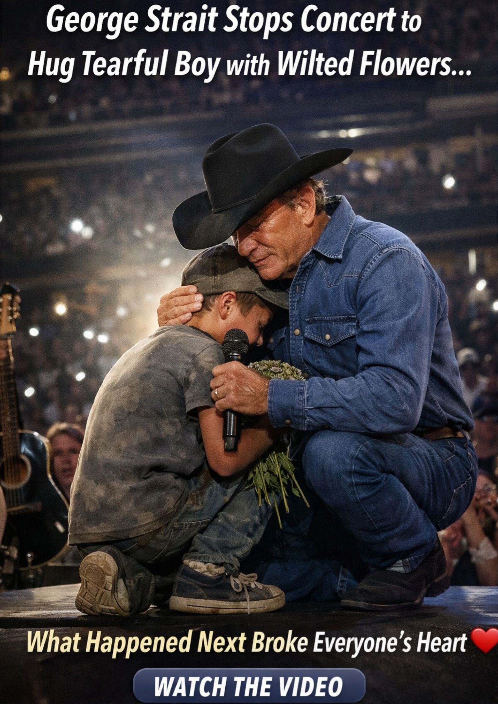 When Strait helped him onto the stage and asked for his mother’s name, the boy whispered it softly. Strait repeated it into the microphone so the entire arena could hear — not like an announcement, but like a prayer.