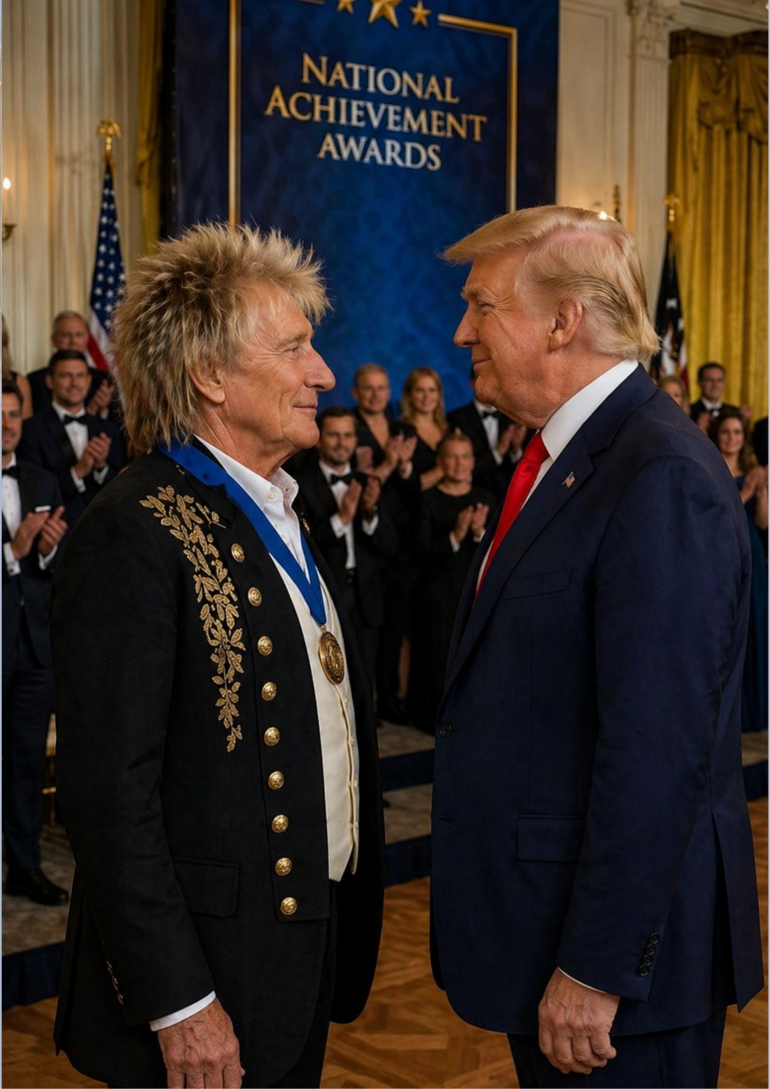 When Donald Trump stepped forward to honor Rod Stewart, the setting itself—the East Room of the White House—seemed to shift in tone. Traditionally reserved for moments of solemn diplomacy and historic gravity, it became, for one evening, a stage not of politics, but of personality. And that distinction matters. Because Rod Stewart has never simply been a singer. He has always been something larger: a presence, a storyteller, a living echo of an era when music was not manufactured, but lived.