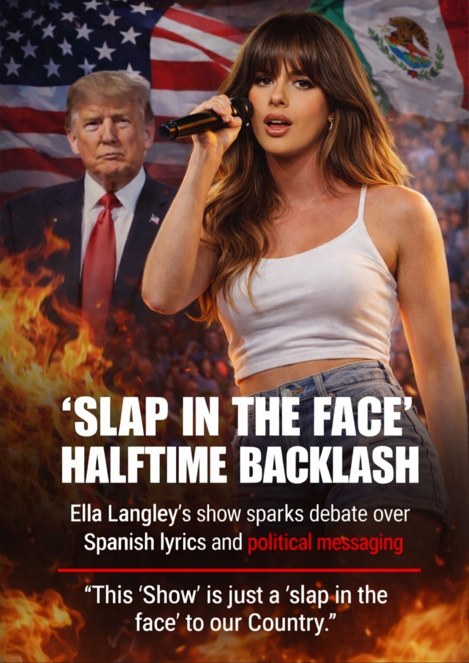 Across social media, posts began circulating claiming that Ella Langley’s halftime show “lit up the stage” and ignited a firestorm over “political messaging” and an “almost entirely Spanish” set—followed by a quote attributed to President Donald Trump calling the performance a “slap in the face” to the country.