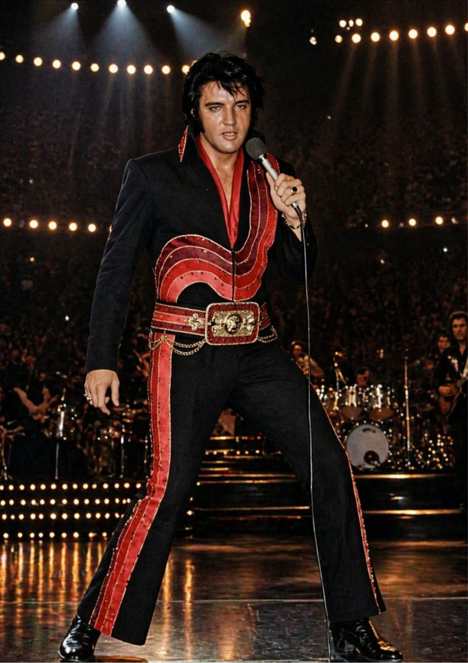By the time he was using it so memorably in the late phase of his live career, Elvis had already become something larger than an ordinary entertainer. He was an American symbol, a global icon, and for many people, a figure wrapped in both nostalgia and myth. Yet one of the most impressive things about this performance is how grounded it remains in physical energy. It is not built only on legend. It works because of craft. Because of rhythm. Because of timing. Because Elvis knew how to inhabit a stage in a way that made every gesture feel larger than life without seeming forced. That is why the song played so well in concert settings, especially in the major performances of the 1970s. It gave him room to be commanding without becoming static, theatrical without losing musical urgency.