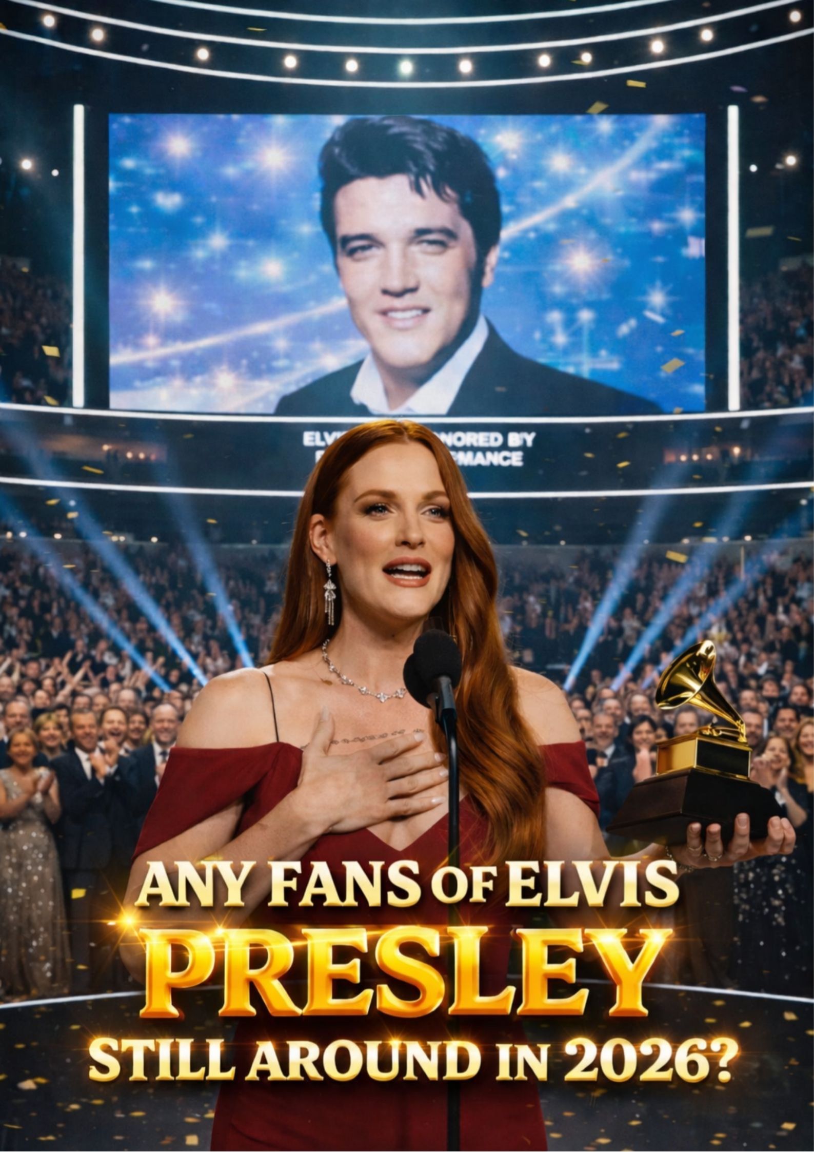 For older listeners especially, that kind of moment lands differently. It is one thing to hear Elvis discussed as an icon. It is another to see the continuity of his life standing before the world in the next generation. That creates a rare emotional overlap between memory and reality. Many people who have loved Elvis for decades do not simply remember songs. They remember where they were when they first heard him. They remember the electricity of his voice, the cultural shock of his style, the tenderness in his ballads, the authority in his phrasing, the loneliness that sometimes seemed to live underneath the charisma. To witness his granddaughter standing there in dignity and grace is to be reminded that legends may grow larger than life, but they also remain part of families, part of private grief, part of human inheritance.