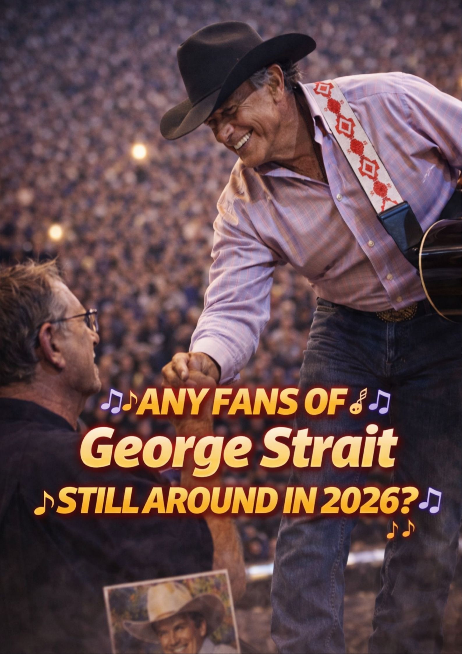 During a pause between songs, George Strait noticed the man. The stage lights were bright. The arena was enormous. Yet somehow, he saw that single fan standing there — holding a piece of musical history in his hands.