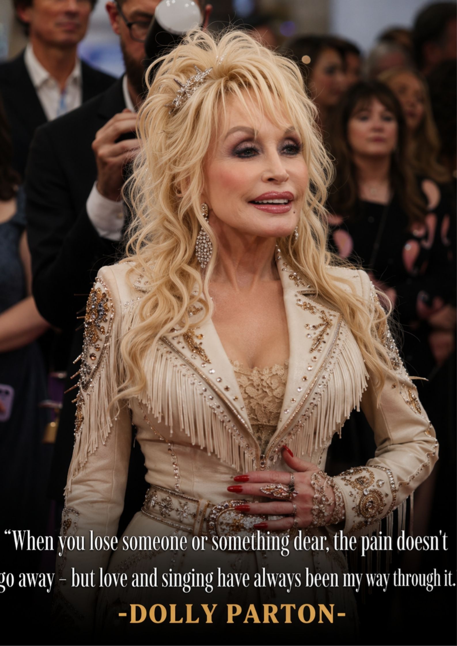 Her words capture that spirit with remarkable simplicity: “You don’t stop when life gets hard — you sing through it.” That line feels unmistakably Dolly, not because it is polished, but because it is true. It contains the philosophy of an artist who has spent a lifetime transforming struggle into song, not to escape pain, but to give it shape. Music, in her world, has never been mere entertainment. It has been testimony, comfort, witness, and survival. To “sing through it” is not to pretend suffering is beautiful. It is to refuse to let suffering have the final word.