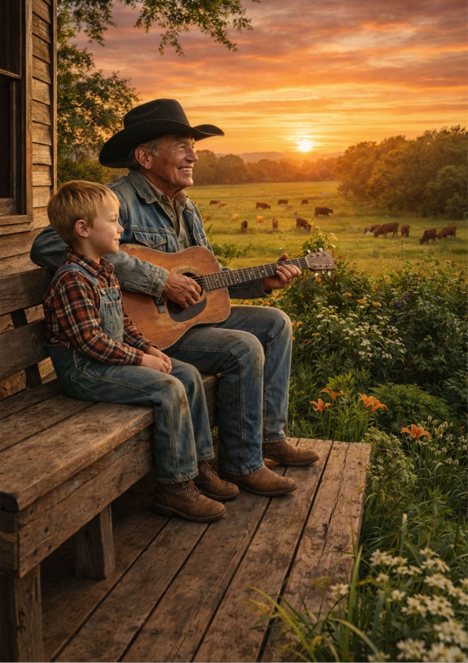 He’s on a splintered wooden porch that has known more years than applause ever could. Worn boots are planted on old boards. A guitar rests naturally in his hands, not as a weapon of legend but as a familiar companion. The cornfields glow gold as the sun slips away, and there is no spotlight—only listening. A small grandchild leans near the railing, the way children do when they sense something important is happening, even if they can’t explain it.